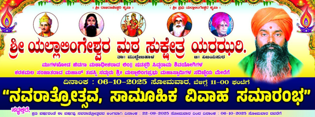 ಮುದ್ದೇಬಿಹಾಳ : ತಾಲ್ಲೂಕಿನ ಯರಝರಿ ಯಲ್ಲಾಲಿಂಗೇಶ್ವರ ಮಠದಲ್ಲಿ ನವರಾತ್ರೋತ್ಸವದಂಗವಾಗಿ ಅ.6ರಂದು ಬೆಳಗ್ಗೆ 11ಕ್ಕೆ ಸಾಮೂಹಿಕ ವಿವಾಹ ಕಾರ್ಯಕ್ರಮ ಹಮ್ಮಿಕೊಳ್ಳಲಾಗಿದೆ.